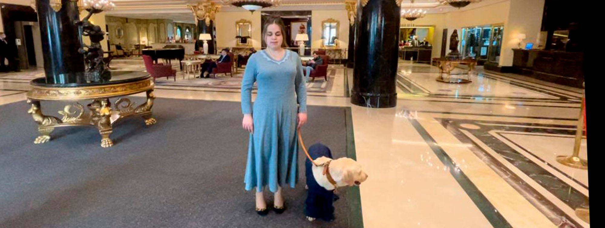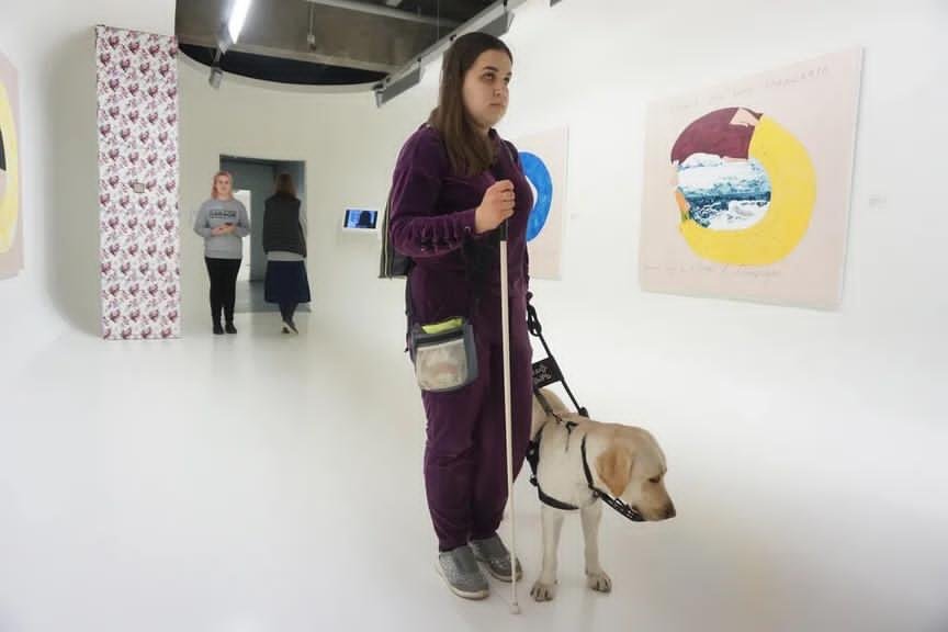 Тифлокомментарий: цветная фотография. Выставочный зал с белым полом и стенами. Александра Майдан в плотном трикотажном костюме фиолетового цвета стоит в центре помещения. Ее взгляд расфокусирован. В правой руке она держит белую трость, левой за жесткую шлейку придерживает лабрадора. На стене висят яркие картины.