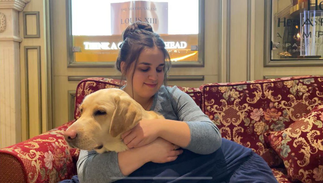 Тифлокомментарий: цветная фотография. На красном диване с цветочным узором сидит Александра в голубом трикотажном платье. Волосы девушки собраны в тугой узел на затылке. Ее большие глаза закрыты, на губах — легкая улыбка. Обеими руками девушка обнимает палевого лабрадора. Глаза собаки прикрыты. Позади видна часть декорированной светлой стены.