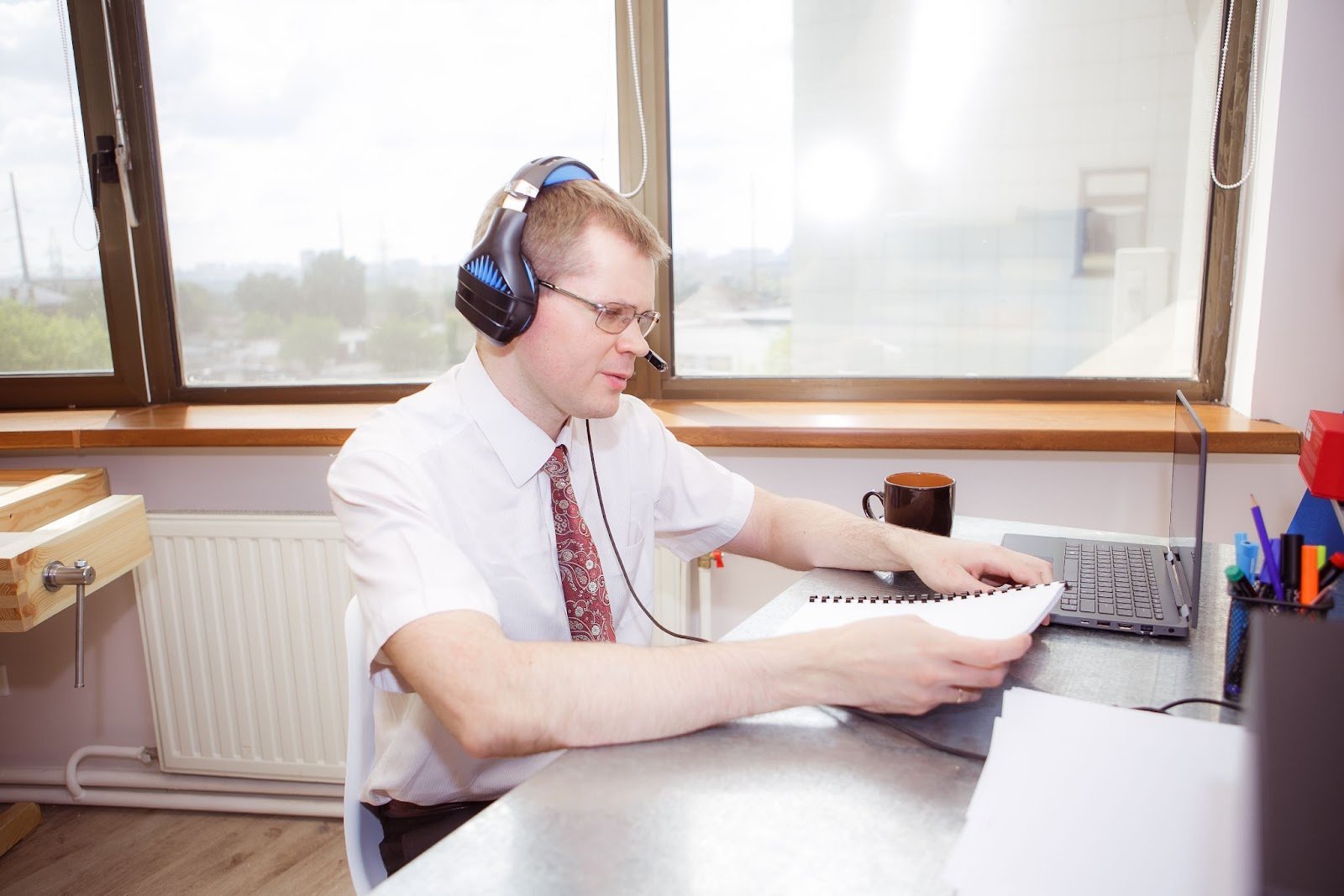 Тифлокомментарий: цветная фотография. Тот же офис. У большого окна сидит молодой человек в белой рубашке с коротким рукавом и красном галстуке с цветочным узором. На его голове гарнитура: массивные наушники с микрофоном, на глазах очки в тонкой оправе. Мужчина держит перед собой тетрадь на пружине. Перед ним на столе стоит открытый ноутбук, принтер, ручки и карандаши в подставках.