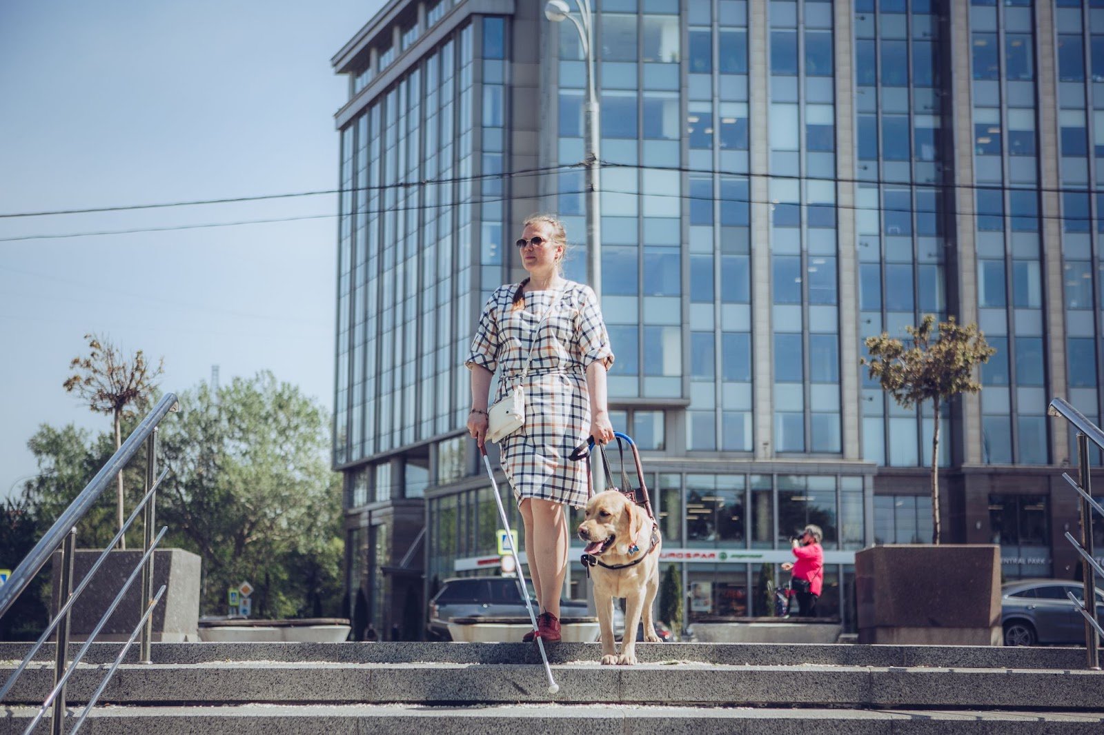 Тифлокомментарий: цветная фотография. Безоблачный летний день в городе. Перед спуском у лестницы стоит белокурая девушка в черных очках и светлом платье. В ее правой руке белая трость, левой она держит за шлейку палевого лабрадора. Позади них — многоэтажное здание со стеклянным фасадом.