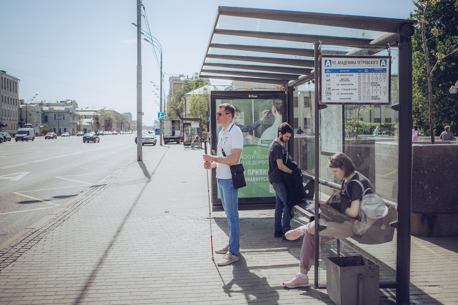 Тифлокомментарий: цветная фотография. Ясный летний день. На автобусной остановке три молодых человека ждут транспорт. Среди них — уже знакомый нам брюнет в черных очках, белой футболке и джинсах. Он стоит лицом к проезжей части, опирается на белую трость. На остановке белая табличка с крупной черной надписью «Ул. Академика Петровского» и списком маршрутов.