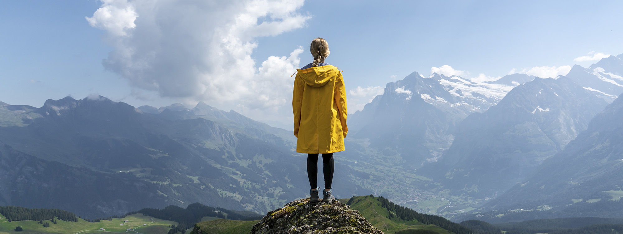 Тифлокомментарий: цветная фотография. На траве, сложив руки на животе, лежит девушка в желтом плаще с капюшоном, плотно облегающим ее голову и шею. На глазах девушки темные очки. Рядом на земле лежит серебристый фотоаппарат. Позади, на фоне серых облаков, высятся горы.
