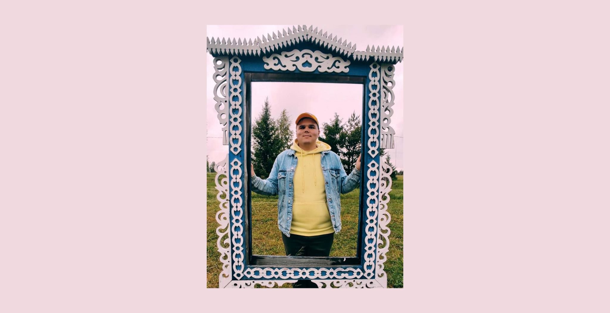 Тифлокомментарий: цветная фотография на розовом фоне. Пасмурный летний день. На лужайке установлена синяя деревянная оконная рама с белыми резными наличниками. Владимир стоит в ее проеме, улыбается. На нем черные штаны, джинсовка поверх желтой толстовки и кепка.