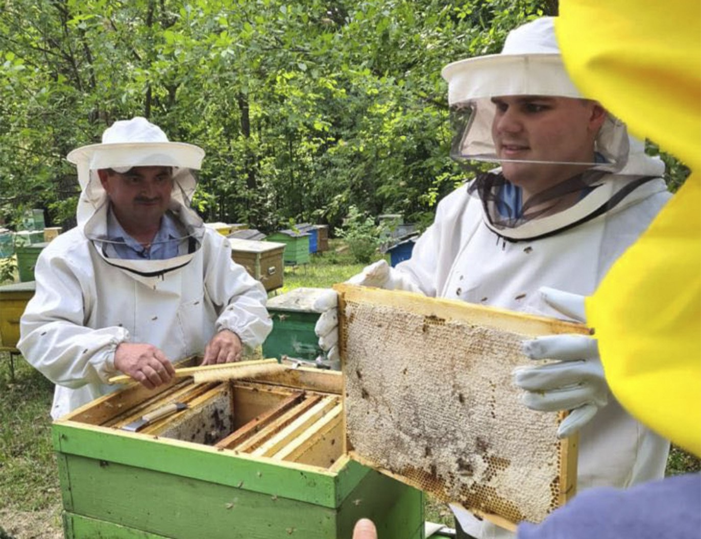 Тифлокомментарий: цветная фотография. Ясный летний день на пасеке. Владимир и коренастый мужчина лет сорока стоят у открытого зеленого улья. Владимир держит деревянную дощечку с сотами, его спутник — деревянную щетку. На них белые защитные костюмы, перчатки и шляпы с лицевыми сетками.