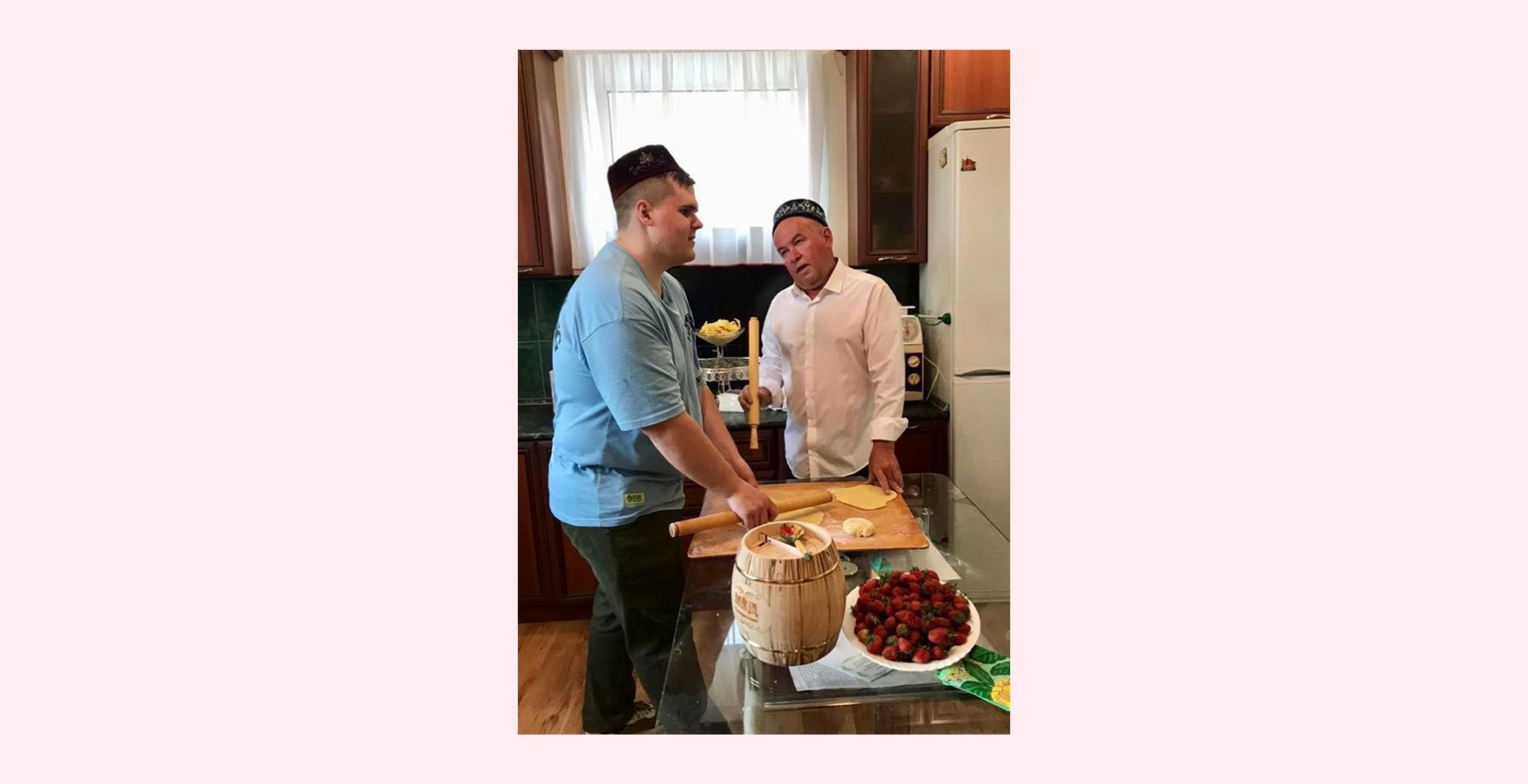 Тифлокомментарий: цветная фотография на розовом фоне. Владимир в темных штанах и голубой футболке и мужчина лет пятидесяти в белой рубашке стоят у стеклянного кухонного стола, скалками раскатывают тесто. У обоих на головах тюбетейки. На столе также стоят тарелка с клубникой и бочонок меда.