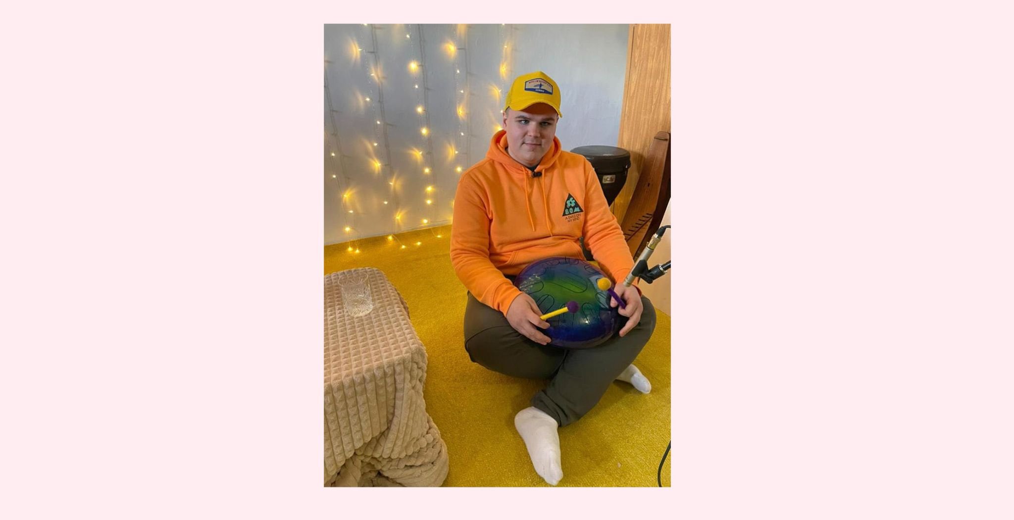 Тифлокомментарий: цветная фотография на розовом фоне. Владимир сидит по-турецки на желтом ковре, играет палочками на глюкофоне — лепестковом барабане сферической формы. На Владимире темные штаны, оранжевая толстовка и желтая кепка. Позади него стоит джембе — африканский барабан в виде кубка, на белой стене висит желтая светодиодная гирлянда.