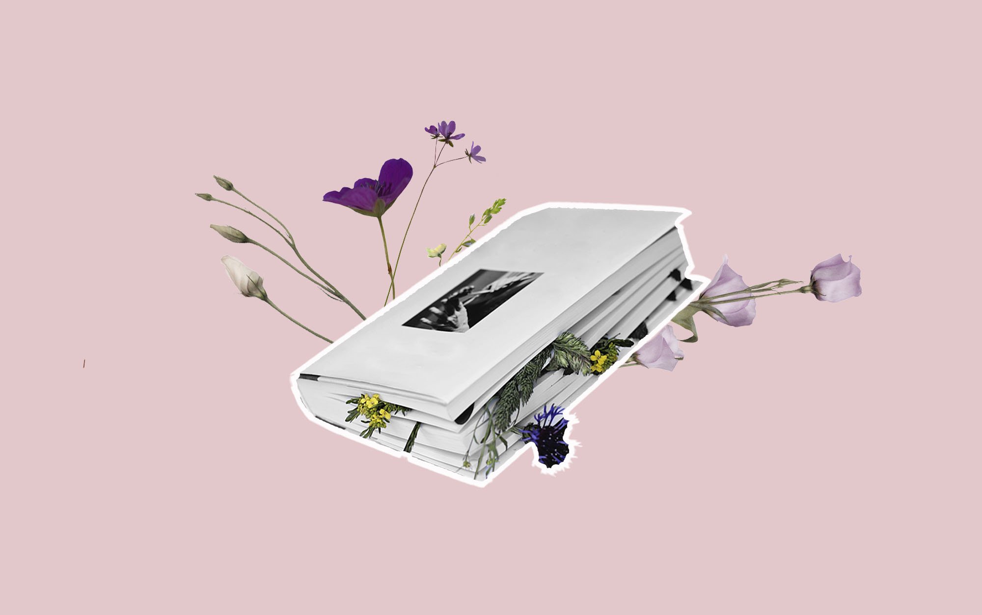 Тифлокомментарий: цветной коллаж. На сиреневом фоне лежит белая книга. Между страниц — длинные стебли, бутоны, сиреневые и фиолетовые цветки. На обложке — черно-белая фотография: портрет активно жестикулирующего человека в театральной маске.