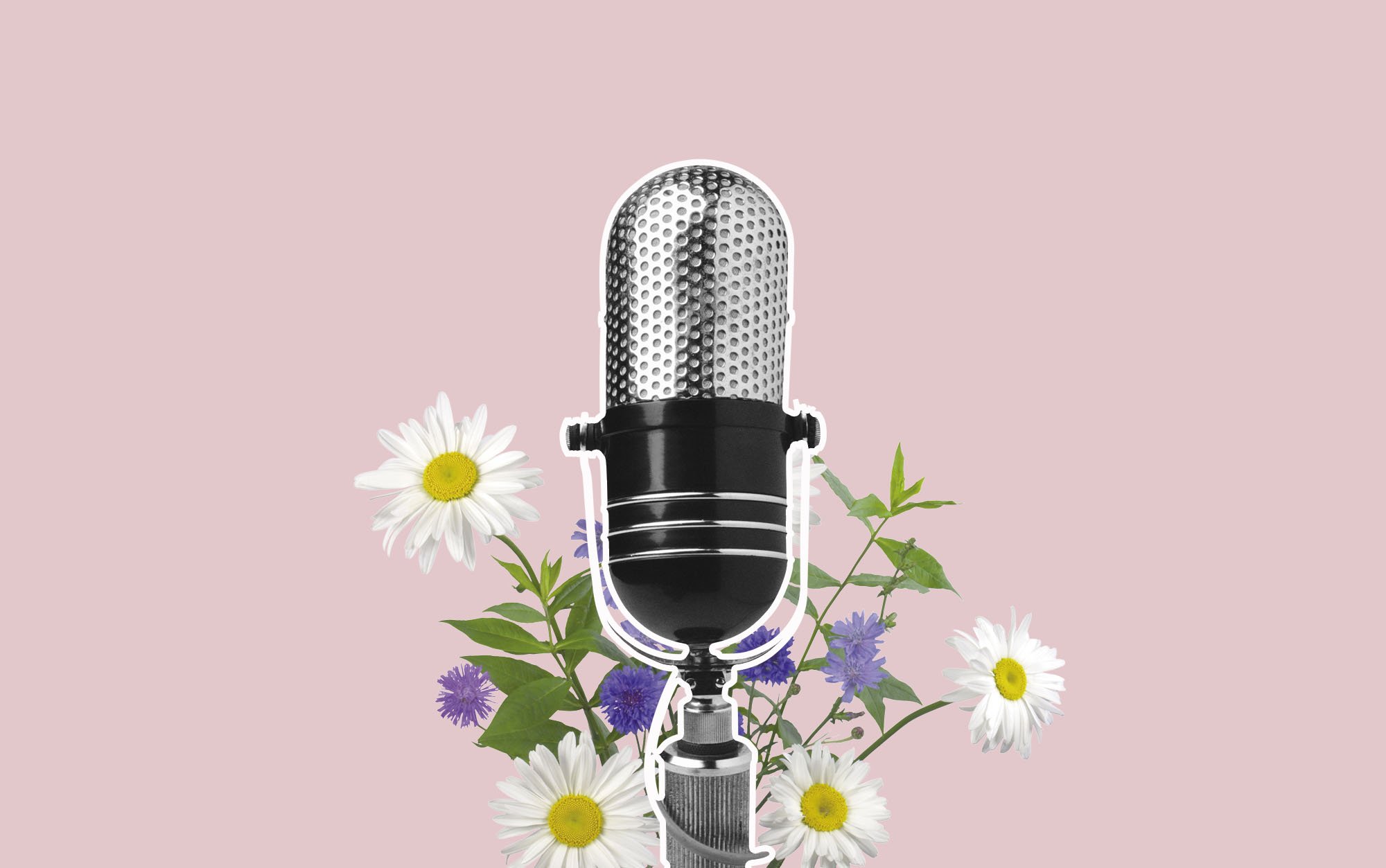 Тифлокомментарий: цветной коллаж. На сиреневом фоне стоит округлый студийный микрофон для звукозаписи, серебристого и черного цвета. За ним — свежий букет полевых цветов — ромашек и васильков.