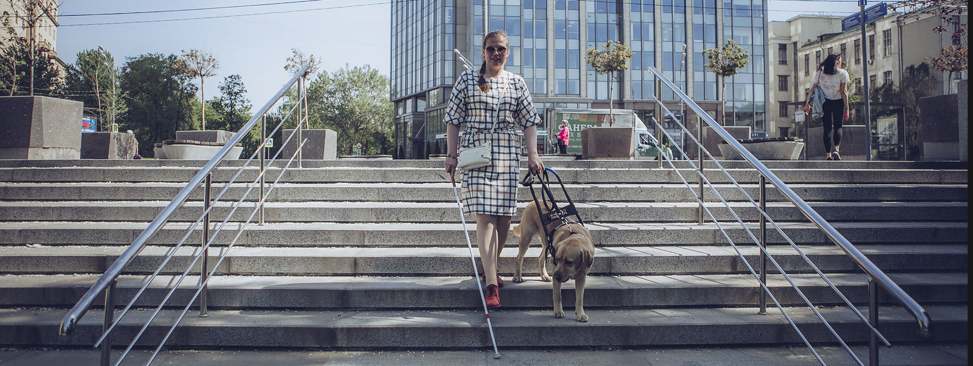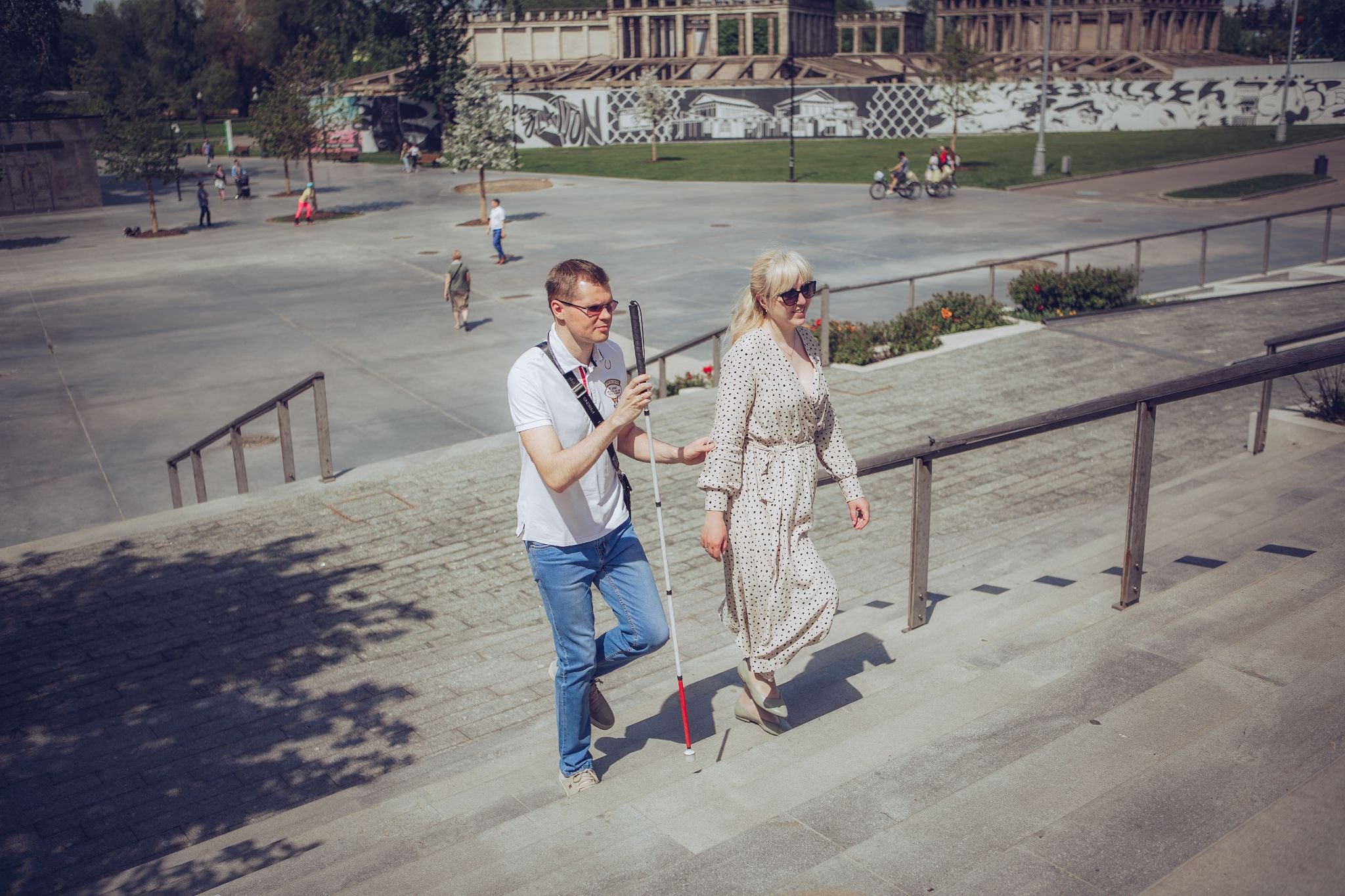 Тифлокомментарий: цветная фотография. Солнечный летний день в парке. Уже знакомый нам брюнет вместе с Мартой Любимовой поднимается по лестнице. Мужчина в одной руке держит белую трость, другой — придерживает Марту за локоть, идет чуть позади нее. На Марте светлое длинное платье и солнцезащитные очки, длинные светлые волосы убраны в хвост.