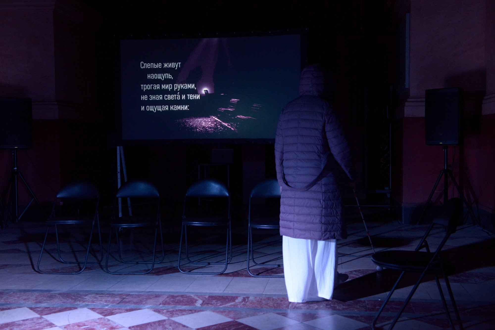 Тифлокомментарий: цветная фотография. Фрагмент театральной постановки. На затемненной сцене с кафельным полом спиной к зрителям стоит человек в белом длинном платье и стеганой фиолетовой куртке с капюшоном. В руках у него белая с красными полосками трость. Перед фигурой стоит ряд черных стульев и темный экран с видеопроекцией. На нем надпись: «Слепые живут наощупь, трогая мир руками, не зная света и тени и ощущая камни».