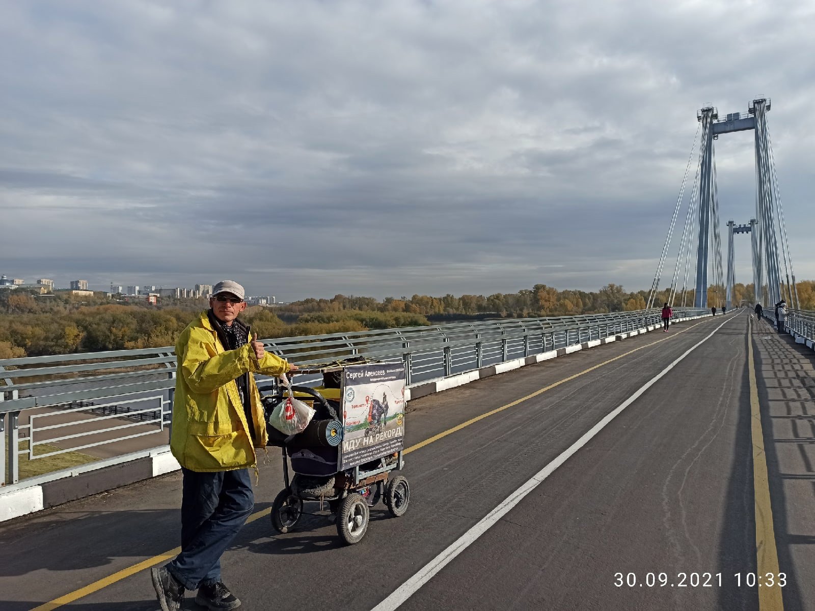 Тифлокомментарий: цветная фотография. Пасмурный осенний день. Сергей в серой кепке, желтой куртке и черных штанах стоит на автомобильном мосту. Левой рукой держит за ручку детскую коляску, набитую вещами. На ней висит цветной баннер с надписью «Сергей Алексеев. Иду на рекорд». Под мостом — водоем, за ним широкая лесная полоса. Вдалеке виднеются высотки.