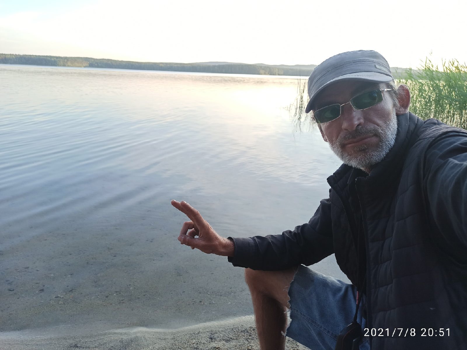 Тифлокомментарий: цветная фотография. Летний вечер. Сергей сидит на берегу водоема, на нем серая кепка, черные рубашка и жилетка, джинсовые шорты с рваными краями. Закатное солнце отражается в воде. На дальнем берегу — лесополоса.