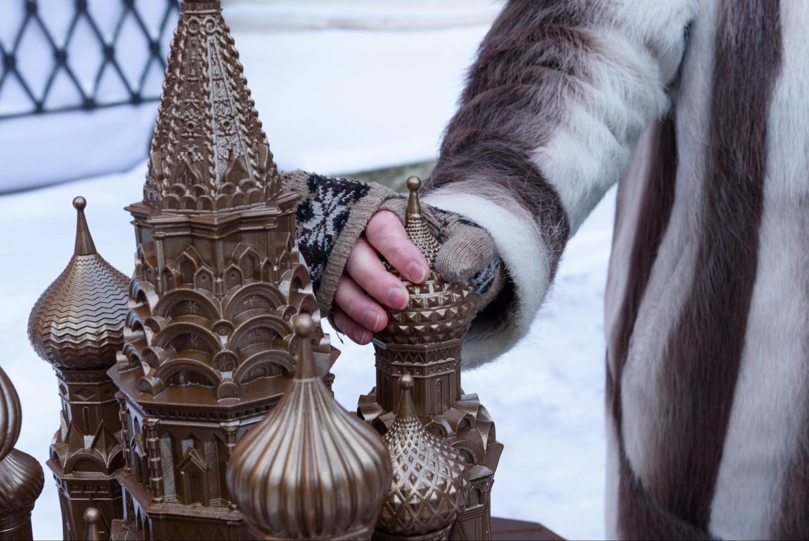 Тифлокомментарий: цветная фотография. Зимний день. Женщина в светлой шубе изучает тактильную модель Храма Василия Блаженного бронзового цвета. Ее ладонь обхватывает один из малых куполов. Каждый фигурный купол собора имеет свой рисунок и рельеф.