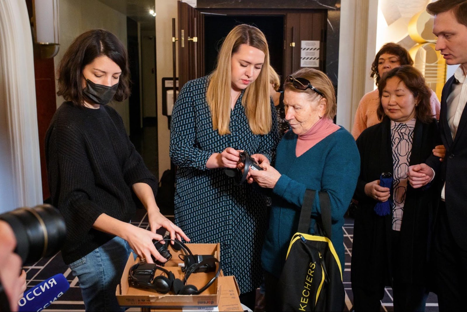 Тифлокомментарий: цветная фотография. В просторном светлом фойе стоят люди в повседневной одежде. Две девушки, блондинка и брюнетка, раздают посетителям черные наушники и приемники для тифлокомментария. Блондинка объясняет невысокой женщине средних лет, как пользоваться аппаратурой. Глаза женщины закрыты, она внимательно изучает приемник руками.