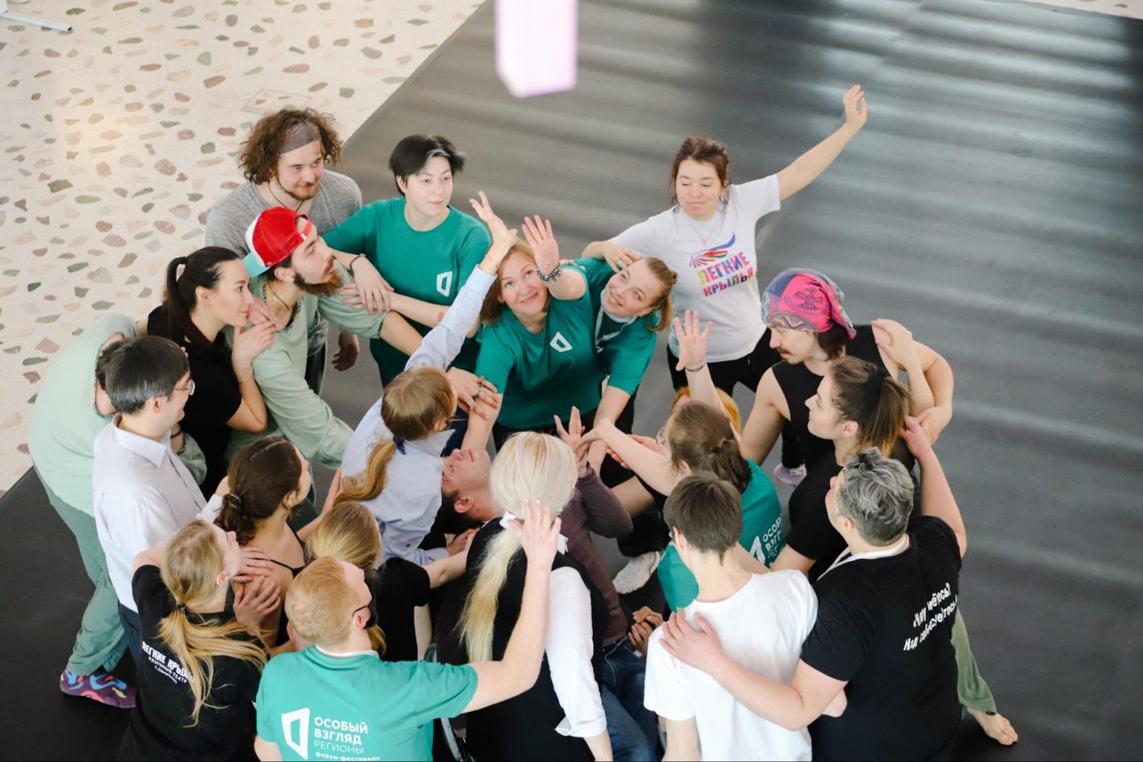 Тифлокомментарий: цветная фотография. Просторное светлое помещение. Участники форума-фестиваля социального театра «Особый взгляд» в Казани, два десятка юношей и девушек, собрались в тесный круг. В центре круга на коленях стоит молодой человек. Его голова запрокинута, глаза закрыты. Остальные окружают его, тянутся руками вверх, обнимают друг друга за плечи. Многие улыбаются, смеются. На некоторых участниках — зеленые футболки с надписью «Особый взгляд. Регионы».