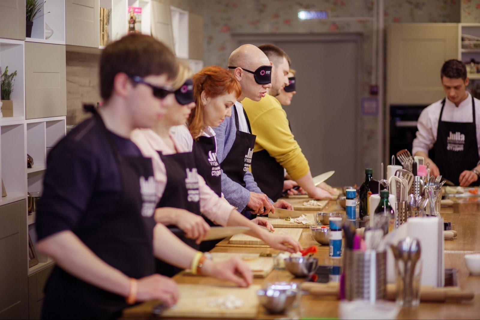 Тифлокомментарий: цветная фотография. Светлое просторное помещение. За большим столом в ряд стоят шесть мужчин и женщин в черных фартуках. Это участники мастер-класса «Готовить могут все», организованного программой «Особый взгляд». Они что-то режут на разделочных досках. Двое работают с закрытыми глазами, глаза остальных закрыты темными очками или плотными черными повязками. На столе перед ними небольшие миски, столовые приборы в подставках. Во главе стола за разделочной доской стоит молодой мужчина в белой рубашке и черном фартуке.