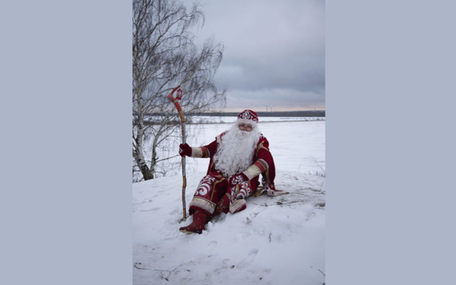 Тифлокомментарий: цветная фотография. Зимний пейзаж. На снежном холме около березы сидит Дед Мороз с длинной белоснежной бородой. Это Алексей Иванович Гришаев. На нем красная шуба, варежки и шапка с белым орнаментом, красные сапоги. На носу очки в круглой красной оправе, в правой руке — кривой деревянный посох с красным фонарем на верхушке.