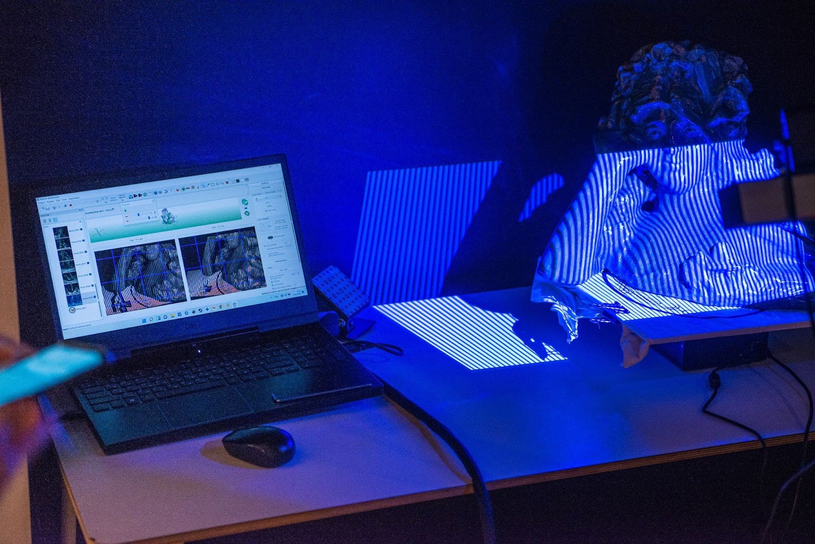 Тифлокомментарий: цветная фотография. 3D-сканирование скульптуры Михаила Врубеля «Весна». Прямоугольный стол у стены. На нем открытый ноутбук и скульптура — бюст девушки в цветочном венке. На бюст направлен широкий синий луч, на экране ноутбука трехмерная модель скульптуры.