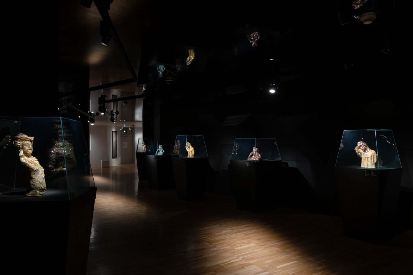 Тифлокомментарий: цветная фотография. В зале с черными стенами полумрак. По периметру стоят черные тумбы. На них представлены скульптуры художника, выполненные в технике майолика. Они накрыты стеклянными колпаками и точечно освещены.