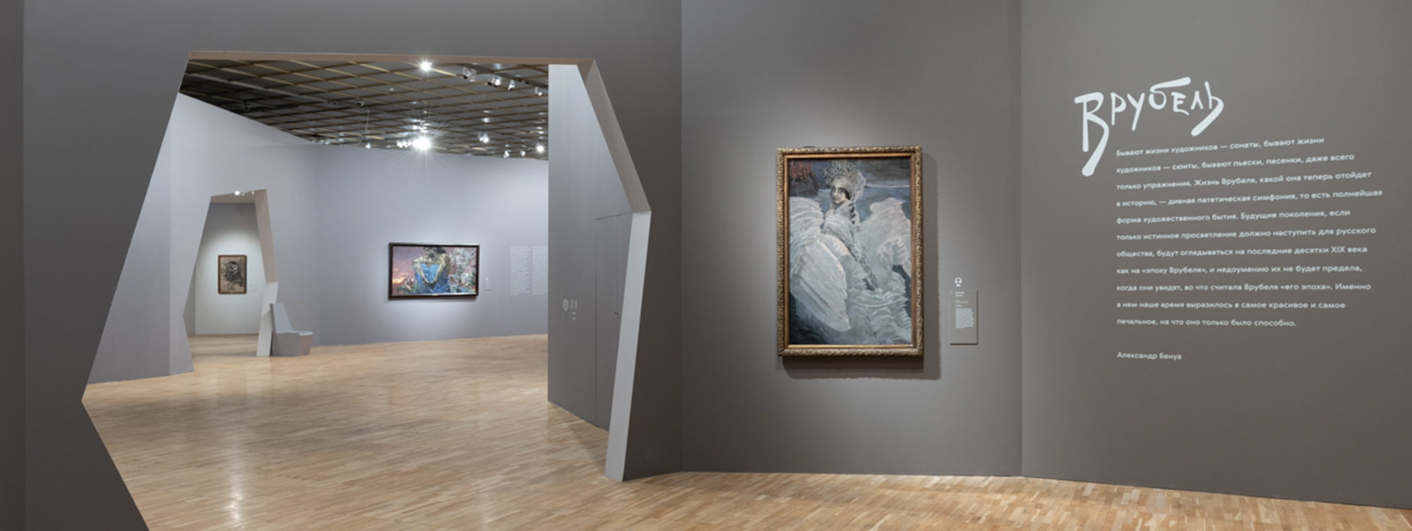 Прогулка по выставке началась с третьего этажа. Здесь из больших панелей соорудили мозаику из многогранников. Еще в этих помещениях прорубили окна необычной формы, в них нет ровных линий, это своеобразные «порталы» в разные миры художника. Надо сказать, что у Врубеля все темы и смыслы связаны между собой. И работал он во многих жанрах: живопись, графика, майолика, театральные декорации и костюмы, оформление интерьеров зданий, роспись храмов.