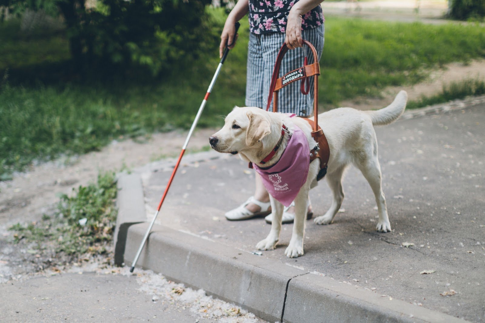 Тифлокомментарий: цветная фотография. Летний день. Тот же лабрадор стоит у ног хозяйки перед спуском с тротуара. Женщина левой рукой держит его за жесткую коричневую дугу шлейки с надписью «Собака-поводырь», правой рукой — белую трость. Вдоль тротуара идет узкая тропинка, растет густая трава.