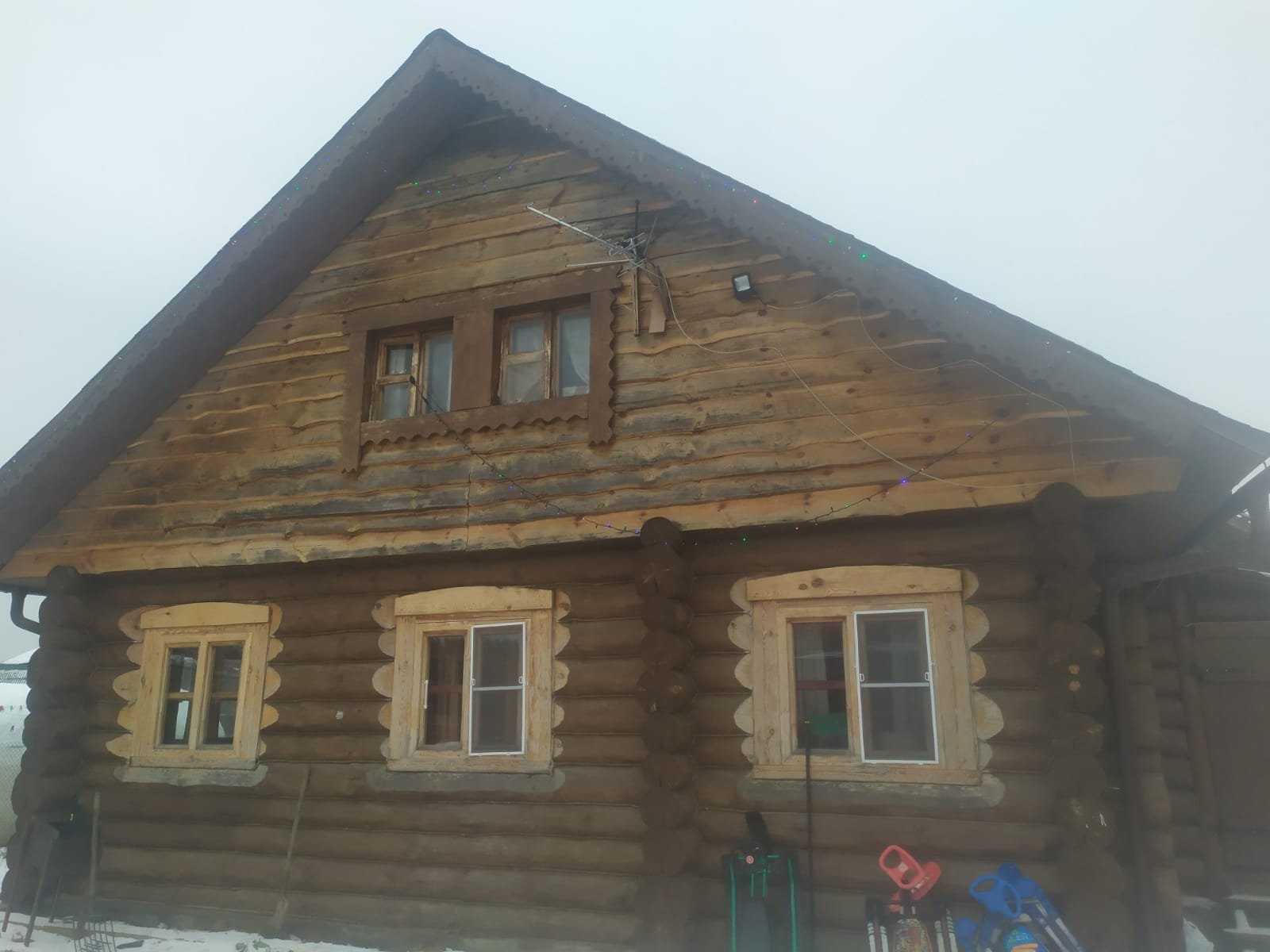 Тифлокомментарий: цветная фотография. Зимний день. Крупным планом двухэтажная изба в три окна с двускатной крышей.