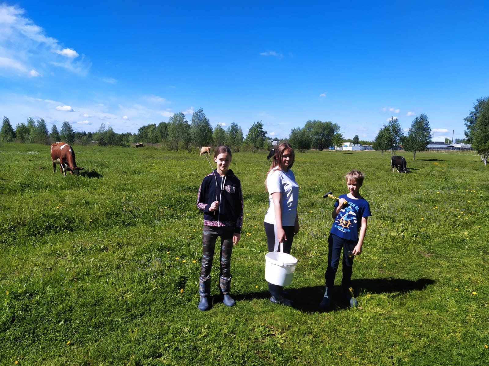 Тифлокомментарий: цветная фотография. Солнечный летний день. На пастбище стоят девочка лет одиннадцати, русоволосая девушка с белым пластиковым ведром и мальчик лет восьми с молотком в руке. На всех футболки, штаны и резиновые сапоги. Позади них пасутся четыре коровы.