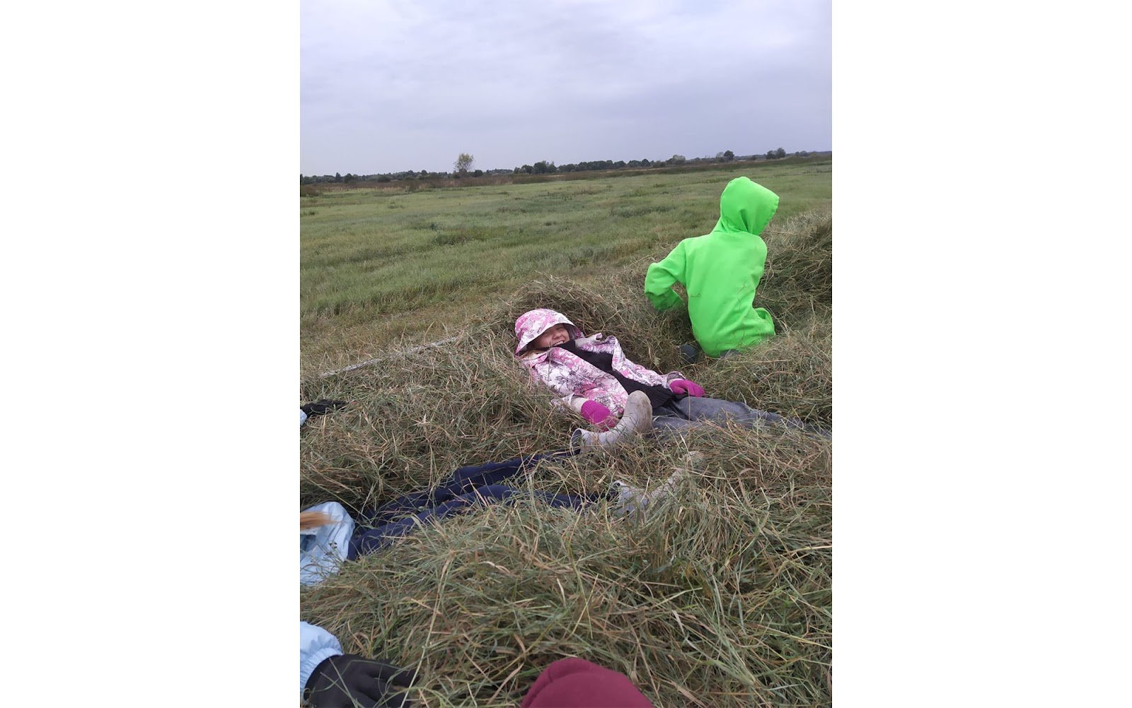 Тифлокомментарий: цветная фотография. Пасмурный осенний день. Трое детей в ярких ветровках и резиновых сапогах валяются в сене, улыбаются. Позади раскинулось зеленое поле, виднеется лесополоса.