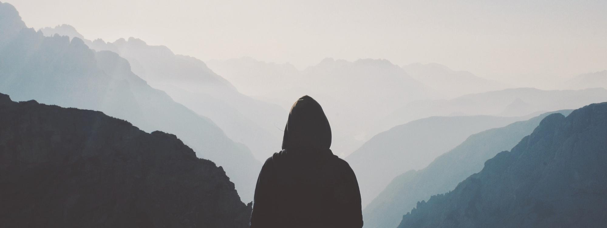 Тифлокомментарий: цветная фотография. Плотные облака окутывают скалистые горы с зелеными склонами. Молодой брюнет стоит на выступе, смотрит вдаль. На нем желтая футболка, черные шорты и кроссовки, за плечами красный походный рюкзак.