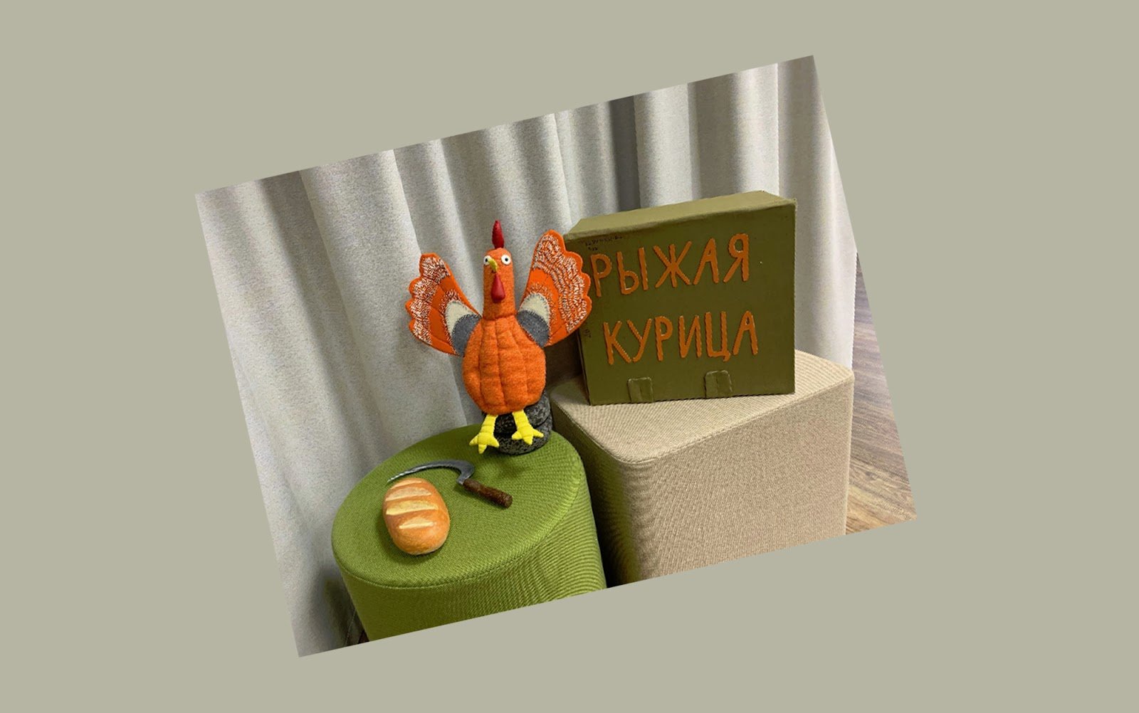 Тифлокомментарий: цветная фотография на сером фоне. Бежевый и зеленый пуфы стоят у серой занавески. На них выставлены мягкая игрушка — курица, тактильные модели в виде батона и серпа и зеленая тканевая коробка с оранжевой надписью: «Рыжая курица».