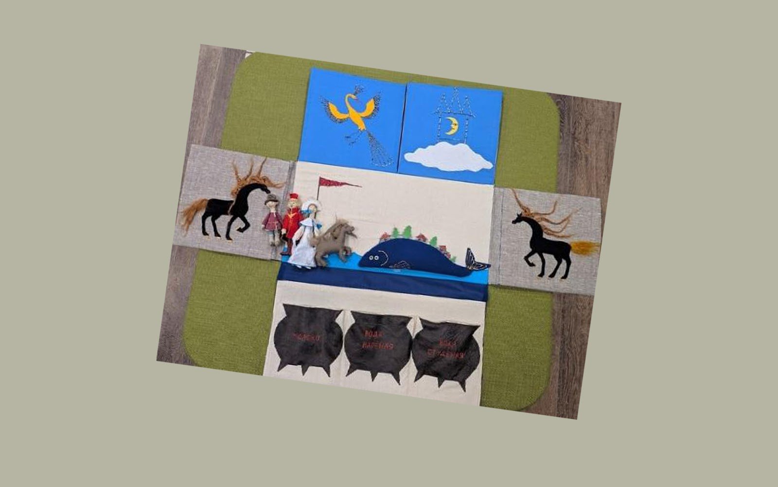 Тифлокомментарий: цветная фотография на сером фоне. Тактильная книжка-раскладушка разложена на деревянном столе. На тканевых разноцветных страницах объемные иллюстрации к сказке «Конек-горбунок»: два черных коня с золотыми гривами, синий кит, желтая жар-птица и маленькие тряпичные куклы царя, царь-девицы, Ивана и серого конька с двумя горбами.