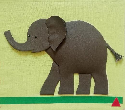 Тифлокомментарий: цветная фотография готовой тактильной иллюстрации «Слон». На светло-зеленом фоне расположена фигура слона из серой искусственной кожи. У него объемное туловище, хвост кисточкой, большое оттопыренное ухо и небольшие глаза-бусинки. По нижнему краю иллюстрации тянется зеленая полоса. В правом нижнем углу — красный треугольник.