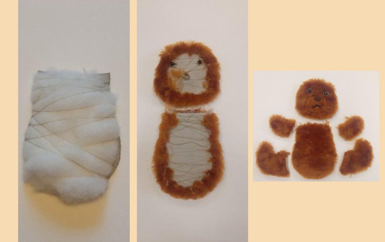 Тифлокомментарий: три цветных фотографии на светлом фоне. Этапы изготовления тактильной иллюстрации «Мишка». На первом снимке к туловищу нитками примотан белый синтепон. На втором: детали туловища и головы с изнаночной стороны. По краям элементов закреплен коричневый мех, обтягивающий деталь снаружи. На третьем фото: туловище, голова без ушей и лапы обтянуты мехом. К мордочке пришиты круглые черные глазки, треугольный нос, вышит рот.