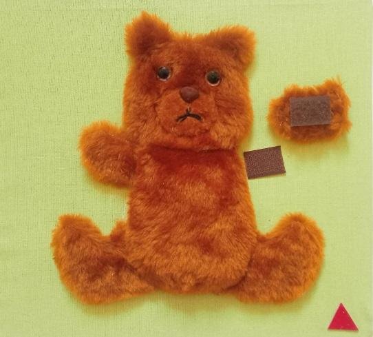 Тифлокомментарий: цветная фотография готовой тактильной иллюстрации. На голове Мишки уши из рыжего меха, правая лапа лежит отдельно. На ее обратной стороне — липучка. Вторая часть липучки закреплена на странице, около туловища. В правом нижнем углу иллюстрации— красный треугольник.
