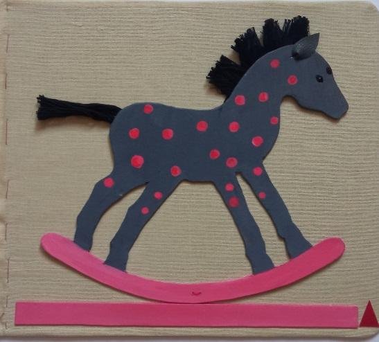 Тифлокомментарий: цветная фотография. Тактильная иллюстрация лошадки-качалки, серой в розовое яблоко. У нее пышные хвост и грива из черных ниток мулине. Качалка стоит на длинном узком основании из розового картона. В правом нижнем углу иллюстрации — красный равнобедренный треугольник.