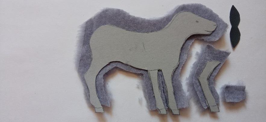 Сделать шаблон из картона, при этом одну заднюю ногу — отдельно. Затем перенести контуры на ткань, оставив припуски и соблюдая направление ворса (шаблон положить так, чтобы копыта не оказались закрыты тканью).