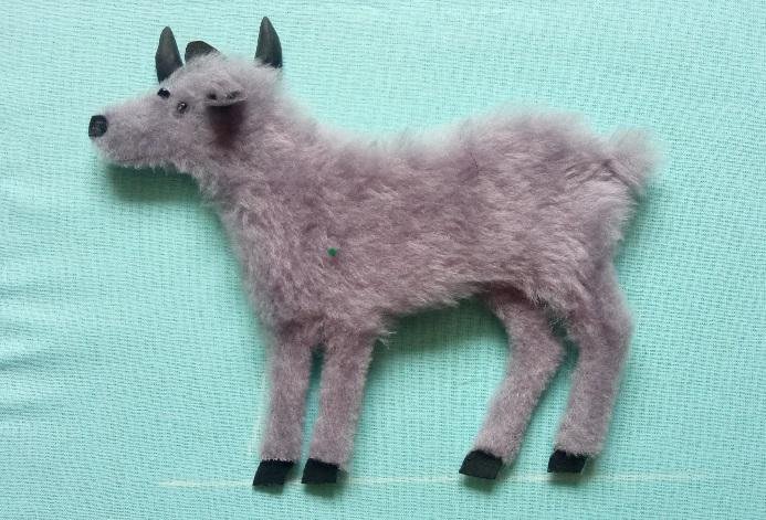 Тифлокомментарий: цветная фотография тактильной иллюстрации. Серый козленок на голубом фоне. У него мягкая шерсть: длинная на теле, короткая на ногах. Нос, уши и рожки из кожи черного цвета, черные копытца и глаза-бусины.