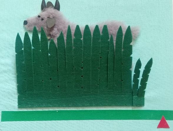 В тексте маленькая хозяйка пасет козленка, он может «потеряться» в траве. Поэтому ее нужно сделать такой высоты, чтобы она полностью скрывала фигуру. Траву из фетра лучше всего пришить нитками.