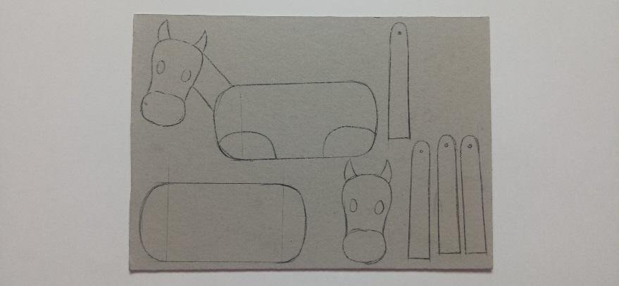 Тифлокомментарий: цветная фотография рисунка на светлом фоне. Простым карандашом нарисованы отдельные элементы Бычка для изготовления тактильной иллюстрации. Это голова и овальное туловище животного, корпус Бычка с головой и четыре одинаковые прямые ножки.