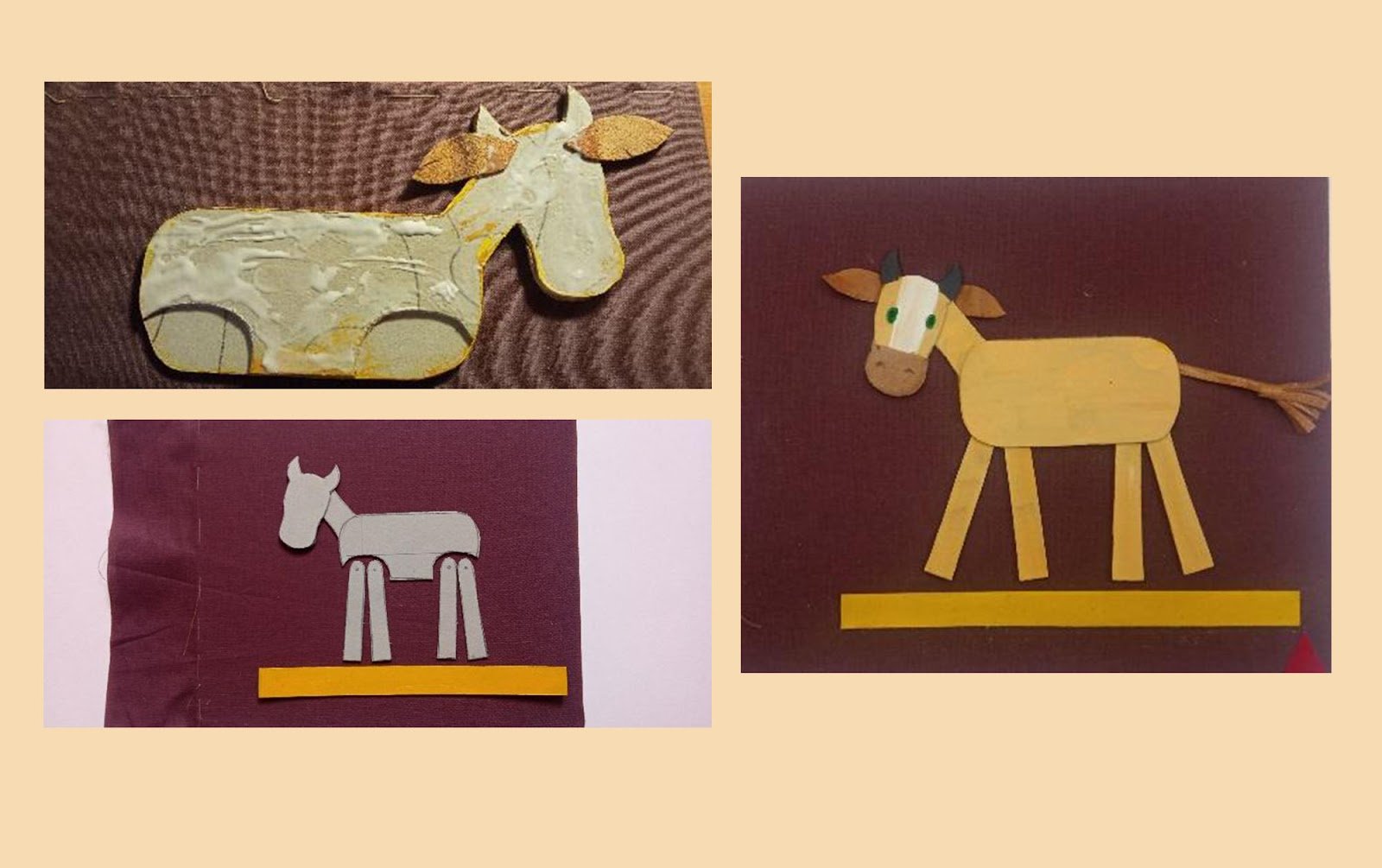 Тифлокомментарий: три цветных фотографии на светлом фоне. Тактильная иллюстрация Бычка на разных этапах изготовления: от картонной заготовки без ног до готовой иллюстрации. Бычок соломенного цвета стоит на желтой широкой полоске. У него одинаковые прямые ножки, белая полоска на лбу, зеленые круглые глаза, хвост метелкой. В правом нижнем углу иллюстрации — красный треугольник.