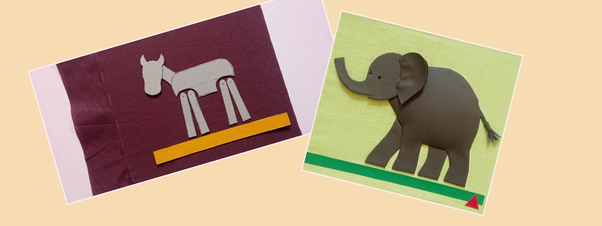 Тифлокомментарий: четыре цветных фотографии на светлом фоне. Этапы создания тактильной иллюстрации «Слон». На первом и втором снимке отдельные детали из картона и те же элементы, обтянутые черным плотным материалом. Вид с изнаночной стороны. На третьем снимке: ухо слона закреплено в прорези головы. На четвертом: к зеленой фоновой ткани иллюстрации пришит черный хвост с метелкой на конце.