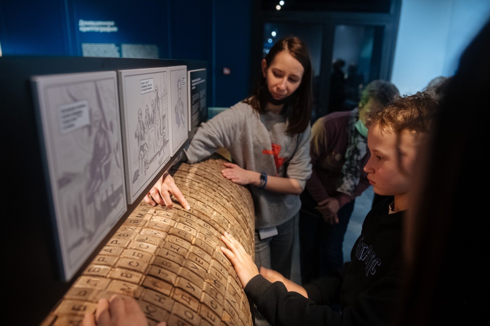 Тифлокомментарий: цветная фотография. Полутемное помещение музея. Дети изучают шифратор Джефферсона. Это деревянный цилиндр, который состоит из дисков, надетых на одну ось. На каждом диске выбиты буквы. Дети трогают диски руками, молодая девушка, придерживает шифратор, указывает на одну из букв пальцем. Вверху, вдоль цилиндра расположены монохромные картинки с описанием изобретения.