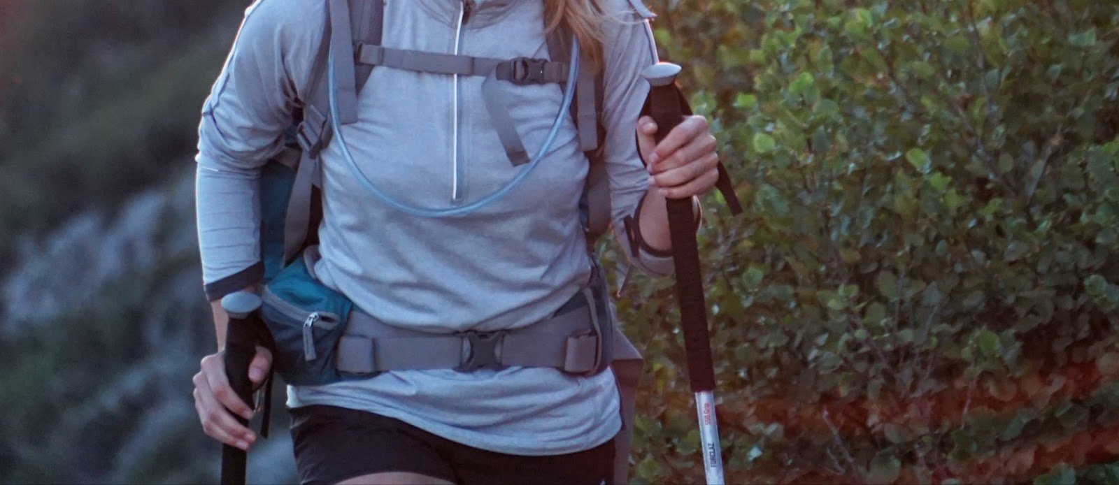 Тифлокомментарий: цветная фотография. По зеленой холмистой местности, опираясь на скандинавские палки, идет девушка. На ней голубая флисовая толстовка и черные леггинсы, за спиной походный рюкзак с поясным ремнем и грудной стяжкой.