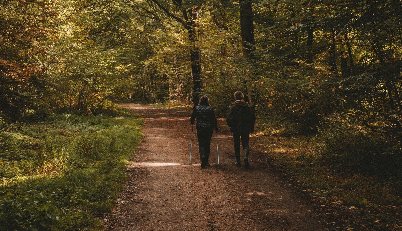 Тифлокомментарий: цветная фотография. По лесной тенистой тропе от нас идут мужчина и женщина. Они одеты в повседневную демисезонную одежду. У женщины в руках палки для скандинавской ходьбы. Справа вдоль дороги стоят высокие лиственные деревья, слева растут кусты, на дорожку ложатся солнечные блики.