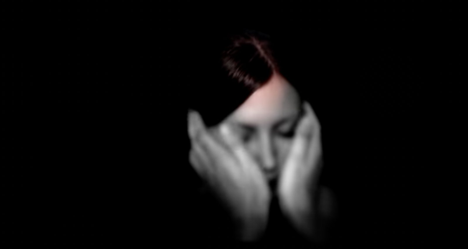 Тифлокомментарий: цветная фотография. В полумраке мужские руки нежно ощупывают лицо темноволосой девушки.