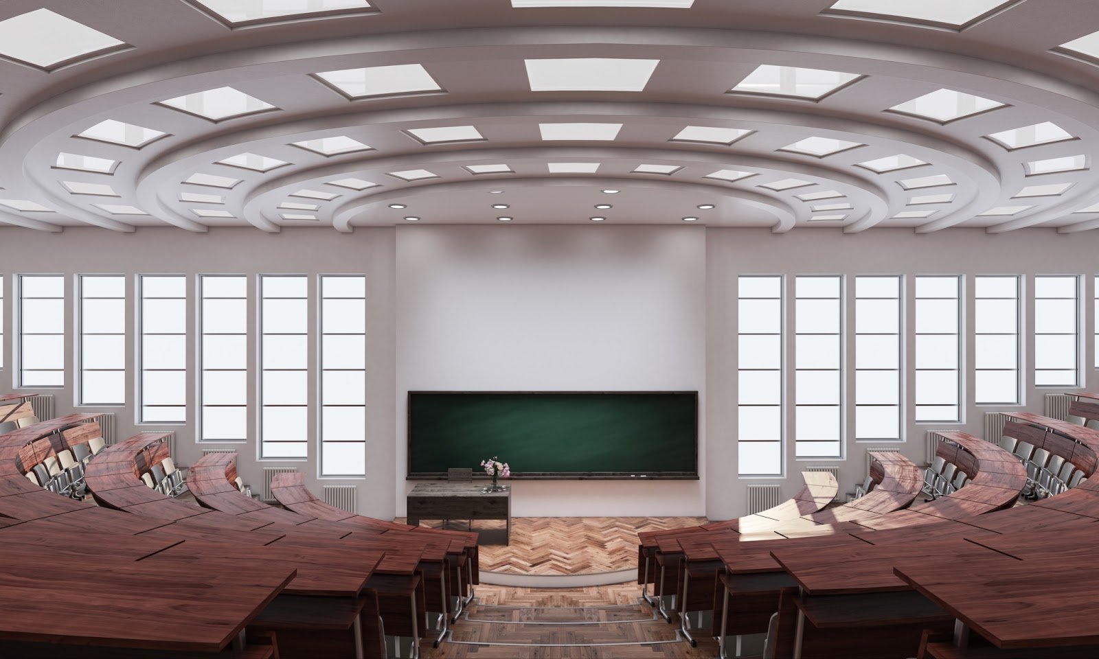 Тифлокомментарий: цветная фотография. Просторный и светлый лекционный зал с высоким потолком. На заднем плане белая стена с зеленой доской для записей вытянутой прямоугольной формы. По обе стороны от нее высокие большие окна, состоящие из квадратных отсеков. Перед доской расположена кафедра — полукруглая сцена для лектора со столом и стулом. К кафедре ведет широкий проход со ступенями. Справа и слева от него рядами стоят парты и стулья для студентов.