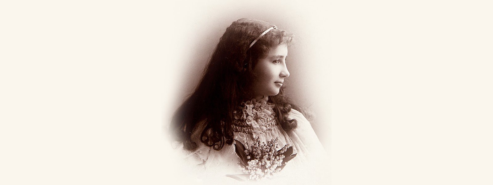 Тифлокомментарий: черно-белая фотография. Поясной портрет Хелен Келлер в подростковом возрасте. Девочка в нарядном белом платье с кружевным жабо изображена в профиль. Ее темные густые волосы, перехваченные тонким белым ободком на макушке, распущены и лежат на плечах. Девочка улыбается, ее глаза блестят, в руках она держит букетик ландышей.