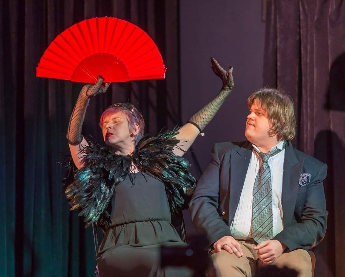 Тифлокомментарий: цветная фотография. Помещение с черными стенами и шторами. Ирина и полный молодой мужчина сидят бок о бок на стульях. Ирина с закрытыми глазами взмахивает над головой раскрытым красным веером. У нее короткие фиолетовые волосы, на губах красная помада, в ушах небольшие красные серьги. На ней черное длинное платье без рукавов, наплечная накидка из черных перьев и длинные черные полупрозрачные перчатки. Мужчина смотрит на нее. У него русые волосы до середины шеи. На нем бежевые брюки, светлая рубашка, серые галстук и пиджак.