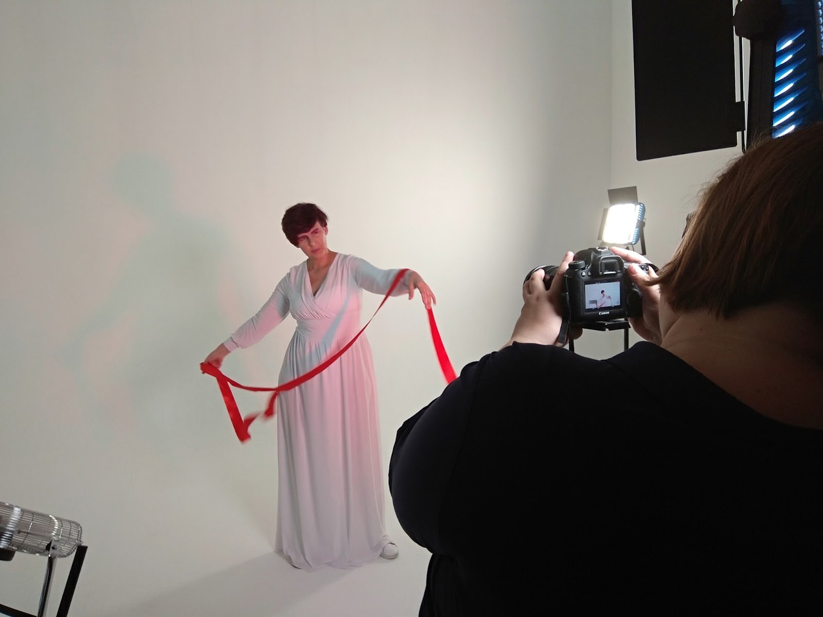 Тифлокомментарий: цветная фотография. Фотостудия. Женщина в черной кофте фотографирует Ирину на зеркальный фотоаппарат. Ирина с короткими фиолетовыми волосами стоит на белом фоне, изящно растягивает в руках красную атласную ленту. На ней белоснежное длинное платье с