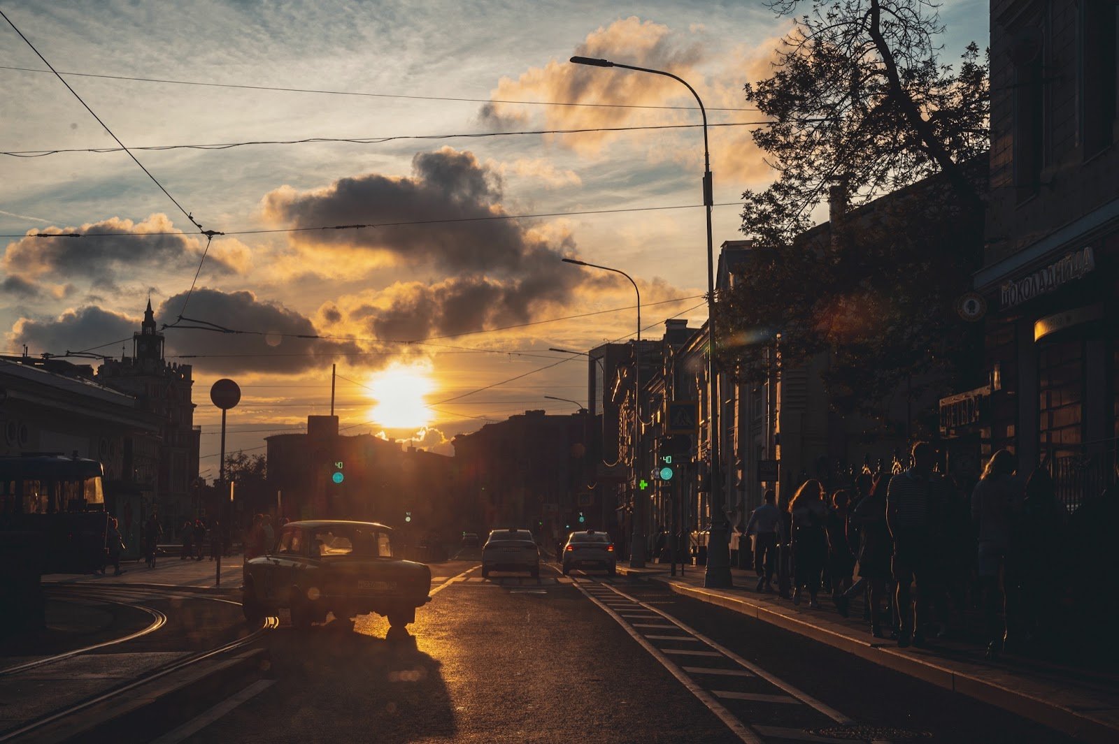 Тифлокомментарий: цветная фотография в контровом свете. Закат. Солнце прячется за тучами. По широкой проезжей части едут редкие автомобили. Правая полоса дороги выделена для движения общественного транспорта и обозначена разметкой. Справа на тротуаре толпятся прохожие. Слева тянутся трамвайные пути.